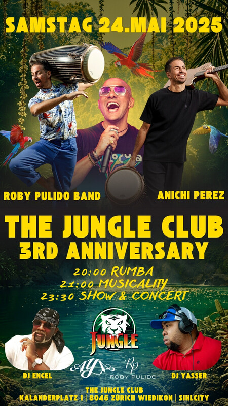 🎉 3 JAHRE THE JUNGLE CLUB! 🎉 Seid dabei, wenn wir unser 3-jähriges Jubiläum gebührend feiern! Am 24. Mai 2025 um 19:45 Uhr verwandeln wir Zürich in einen pulsierenden Dschungel der guten Laune. Euch erwarten besondere Workshops, die eure Tanzskills auf das nächste Level bringen, und eine atemberaubende Salsa Show, die euch garantiert begeistern wird. Lasst uns gemeinsam auf 3 unvergessliche Jahre anstossen und uns auf viele weitere tanzreiche Momente freuen! Wir können es kaum erwarten, mit euch zu feiern! 🌴💃🕺 * SALSA LIVE BAND * * WORKSHOPS * * SHOW * ​* 2 DANCE FLOORS * * SALSA & BACHATA * * ANICHI PEREZ * * ROBY PULIDO * * DJ ENGEL * * DJ YASSER * Timetable 19:45 Open Door 20:00 Rumba Workshop 21:00 Musicality Workshop 22:00 Party ​23:00 Salsa Show & Live Band Party | Live Band | Workshops | Show | Animation 25 CHF Eintritt www.thejungleclub.ch
