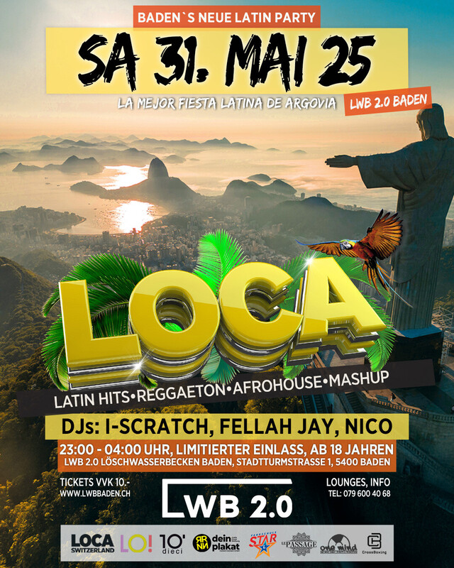 LOCA – Party 🔥 31. Mai 2025 LWB Baden (Aargau) 23:00 – 04:00 Uhr 🌴✨ Heiße Rhythmen, exotische Vibes & pure Lebensfreude – LOCA Latin Party, die neue Latin Party im LWB Baden im Kanton Aargau✨🌴 Mach dich bereit für eine unvergessliche Nacht voller Reggaeton, Afrobeats, Afrohouse und Mashup Party Latin Hits, die dich nicht stillstehen lassen! 🎶💃🏽🔥 ✅ Top DJs – die besten Latin Sounds all night long! ✅ Exotische Drinks & Cocktails – genieße den Geschmack der Karibik und Latin Amerika! 🍹🌺 ✅ Heiße Dance Moves – feiere, tanze & spüre die Leidenschaft! Line-Up: Nico, i-Scratch, Fellah Jay 🔥 Spüre die Hitze, tanze bis zum Morgengrauen & feiere das Leben – LOCA Latin Party ist pure Leidenschaft! 🎟 Sichere dir dein Ticket jetzt & erlebe die heisseste Party des Frühlings! #LOCA #LatinParty #ReggaetonVibes #Badenfeiert https://linktr.ee/locaswitzerland