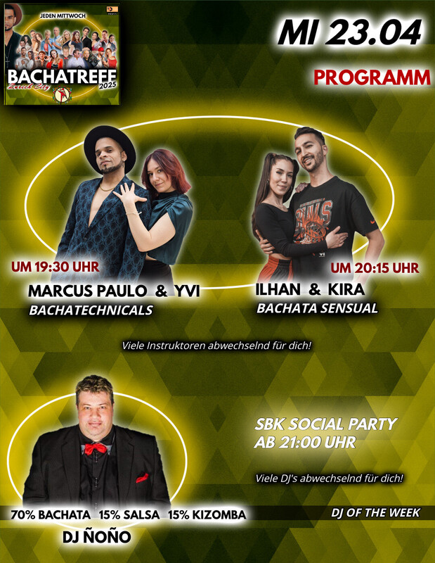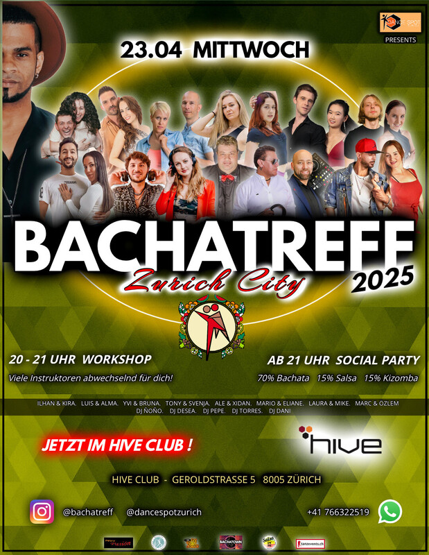 BACHTREFF AT NEW LOCATION! *RE-OPENING SPECIAL EDITION* Hola Bachateros & Bachateras! BACHATREFF öffnet seine Türen ab sofort für euch an einer neuen Location! Ab dem 23.04.2025 findet BACHATREFF im *Hive Club* in Zürich statt. Als Special Re-Opening Edition haben wir für euch für den 23.04. gleich *ZWEI Workshops* organisiert. Es ist uns wichtig, euch die gewohnte Qualität des Events zu bieten, dabei aber auch die Vielfalt des aktuellen Angebots zu unterstützen, einen guten Austausch zwischen den Tänzern zu ermöglichen und auch vielversprechenden neuen Lehrern und Instruktoren die Möglichkeit zu geben, ihr Wissen und ihre Begeisterung für Bachata mit euch zu teilen. EVENTSTRUKTUR: Für die Workshops haben wir viele verschiedene Instruktoren "in round" für euch. Auch für die anschliessende Party werden die DJs im Wochentakt rotieren. Bachatreff ist ein von Dance Spot Zürich organisiertes Event, welches in Zürich stattfindet. Seit nun bereits mehr als 7 Jahren bringen wir neue Tänzer auf die Tanzflächen. Make it your second home! _________________________________________________________ WOCHENPLAN *************** ° 19:30 BACHATECHNICALS by Marcus Paulo & Yvi ° 20:15 BACHATA SENSUAL by Ilhan & Kira _________________________________________________________ ° 21:00 SBK SOCIAL 70% Bachata 15% Salsa 15% Kizomba by DJ Ñoño _________________________________________________________ ° NEUER EINTRITTSPREIS Workshop + Party Pass 25.- Party Pass 10.- _________________________________________________________ ° LOKAL Hive Club Geroldstrasse 5, 8005 Zürich https://www.facebook.com/share/1NMNEUawVe/