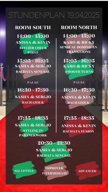 Willkommen zur grössten Bachata Party in Basel! Am 19. April 2025 erwartet dich ein unvergessliches Erlebnis, das du nicht verpassen solltest! Highlights: 🌟 Workshops mit internationalen Artisten: Tauche ein in die Welt der Bachata mit unseren talentierten Gastlehrern und Gastlehrerinnen. Lerne neue Moves und verbessere deine Tanztechnik in einem exklusiven Workshop, der deine Fähigkeiten auf die nächste Stufe bringt. Sasha & Sergio aus England Kevin & Anisa aus Frankreich Ricky & Karolina aus Deutschland und der Schweiz https://www.bachata-basel.ch/details-registrierung/big-bachata-basel-workshopday-party-movies-tv-show 💃🕺 Inklusive Pre-Party Workshop (Open Level): Mach dich bereit für die Party des Jahres! Vor der eigentlichen Party starten wir mit einem speziellen Pre-Party Workshop mit Sergio & Sasha aus England, um die Stimmung anzuheizen und deine Tanzlust zu entfachen. 🎧 Musik von unglaublichen DJs Die besten Beats werden von unseren erfahrenen DJs geliefert, die die Tanzfläche mit mitreissenden Rhythmen füllen. Tanze zu den Klängen von Bachata Hits bis in die frühen Morgenstunden. 🍹🌭 Drinks und Snacks: Geniesse eine Vielzahl erfrischender Getränke und köstlicher Snacks, um deine Energie aufrechtzuerhalten und den Abend in vollen Zügen zu geniessen. 🌈 Shows: Erlebe atemberaubende Tanzshows. Lass dich von beeindruckenden Choreografien und leidenschaftlichen Performances verzaubern. 🎉 Grossartige Stimmung: Freu dich auf eine pulsierende Atmosphäre, getragen von der Leidenschaft für Bachata und dem Spass am Tanzen. Feiere mit Gleichgesinnten und schaffe Erinnerungen, die lange in Erinnerung bleiben werden. 🚨 Letztes Jahr ausverkauft: Sichere dir deine Tickets frühzeitig, denn in den letzten Jahren waren wir ausverkauft! Verpasse nicht die Gelegenheit, Teil dieses unvergesslichen Events zu sein. Sei dabei, wenn Basel in den Rhythmus von Bachata eintaucht und die Party zu einem unvergesslichen Ereignis macht. Wir freuen uns darauf, mit dir zu tanzen, zu lachen und eine Nacht voller Spass zu erleben! Hol dir jetzt deine Tickets und sei Teil dieser sensationellen Bachata MOVIES & TV SHOW Party!