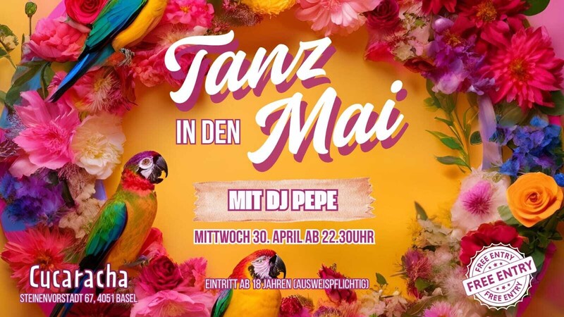 TANZ IN DEN MAI! LATINPARTY mit DJ PEPE Mittwoch, 30. April 2025 feiern wir im Cucaracha, Basel! Am Donnerstag ist frei! Wir fangen um 22:30 Uhr an! Sei dabei! Musik: Salsa, Merengue, Bachata, Reggaeton, Latinhits, u.v.m. EINTRITT FREI!
