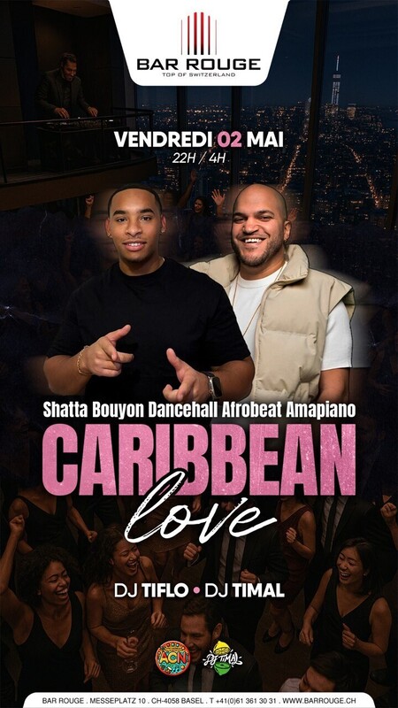 Karibisches Lebensgefühl trifft auf atemberaubende Aussicht über die Stadt Basel: Willkommen bei Caribbean Love – der Party, bei der Rhythmus, Energie und Lebensfreude im Mittelpunkt stehen! Die renommierten DJs Tiflo und Timal sorgen für die perfekten Vibes bis in die frühen Morgenstunden. Music: _30 Shattah, Bouyon, Dancehall, Afrobeat & Amapiano https://www.barrouge.ch/de/events/CaribbeanLove02052025/