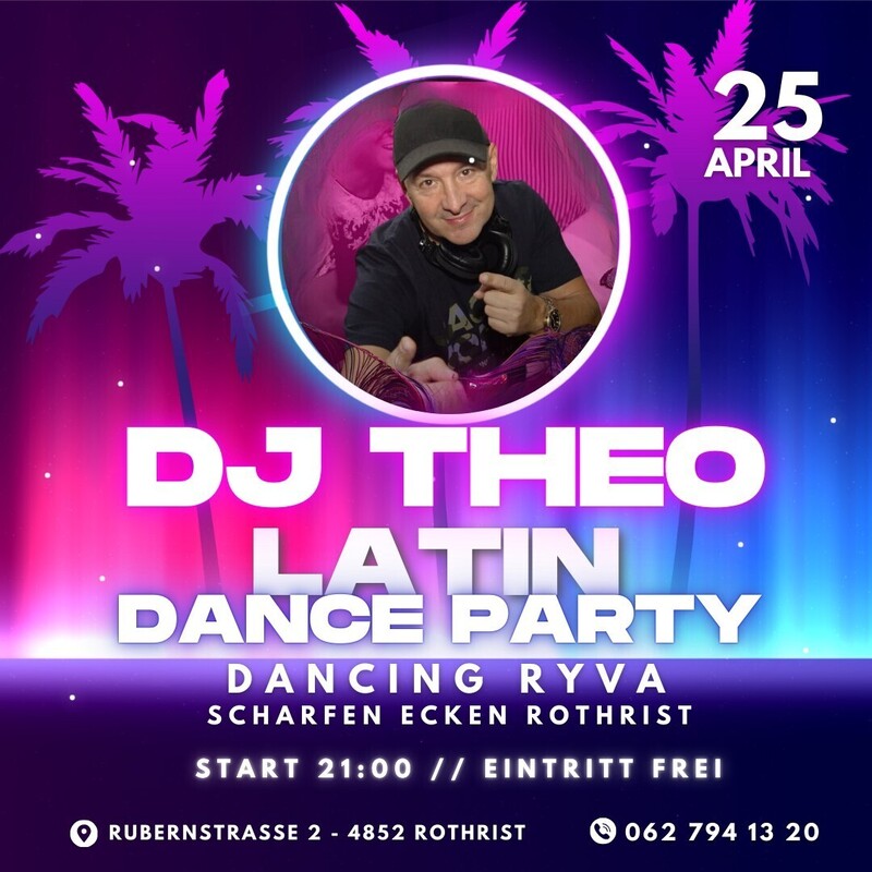 Freitag 25. April ★ LATIN NIGHT ★ ★ Herzlich Willkommen ins Dancing RYVA im Scharfen Ecken SALSA ALL STYLES - BACHATA ALL STYLES - LATIN HITS ★ ★ DJ THEO ★ ★ ---------------------------------------- ★ PROGRAMM: 21:00 Uhr bis 02 Uhr Salsa Party mit DJ THEO Grosse Parkett Tanzboden ---------------------------------------- ★ Frei Eintritt ---------------------------------------- ★ 280 Gratisparkplätze ★ 3 minuten von Autobahn Ausfahrt Rothrist ★ 35 min. ab Luzern, 40 min. ab Zürich, 30 min. ab Basel, 40 min. ab Bern ★ Pizzeria The Fratelli & Restaurant Scharfen Ecken ---------------------------------------- DANCING RYVA zum scharfen ecken Rubernstrasse 2 I 4852 Rothrist I Kanton Aargau I www.ecken.ch Sei Teil einer unvergesslichen Latin Night, präsentiert von DJ Theo! 🔥🎶 Genieße eine heiße Mischung aus Salsa, Bachata, Kizomba und den besten Latin Charts. https://fb.me/e/4tpohhKyS