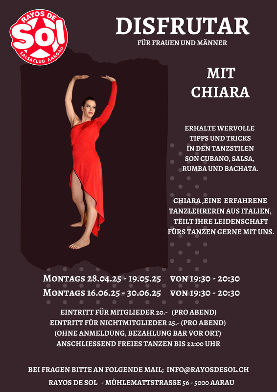 Spezial-Disfrutar – Tanz mit uns in den Sommer! Ein besonderes Tanzangebot von Rayos de Sol – für Mitglieder und Gäste! Was erwartet dich? Tauche ein in die Welt des SON Cubano, Salsa... – mit diesen leidenschaftlichen Stilen starten wir. Doch damit ist längst nicht Schluss: Wir sind offen für weitere Tanzstile, je nach Stimmung und Interesse der Teilnehmenden! Kein Paartanz – du tanzt für dich! Der Fokus liegt auf Körpergefühl, Rhythmus und purem Genuss. Termine & Zeiten: Montags 28. April – 19. Mai 2025 16. Juni – 30. Juni 2025 jeweils von 19:30 – 20:30 Uhr Danach: freies Tanzen bis 22:00 Uhr Kosten pro Abend: Mitglieder von Rayos de Sol: CHF 20.– Nichtmitglieder: CHF 25.– Keine Anmeldung nötig – einfach vorbeikommen und vor Ort bezahlen! Für wen? Für alle, die Freude an Musik, Bewegung und Gemeinschaft haben – ganz egal ob du schon tanzt oder einfach mal reinschnuppern willst. Fragen? Melde dich gerne bei uns unter: info@rayosdesol.ch Komm vorbei, tanze mit uns... www.rayosdesol.ch