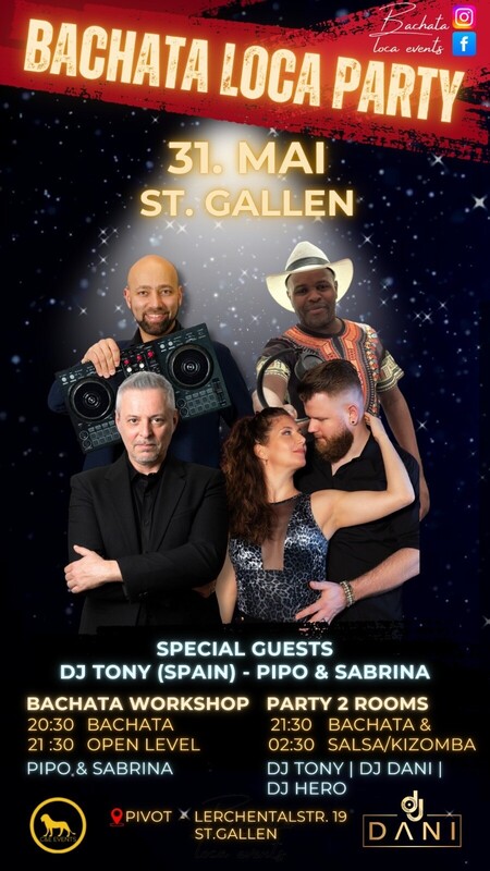 🌟🌟Aufregender Bachata-Party-Event mit Pipo & Sabrina (von Bailemos, Basel) & DJ Tony (Aus Spanien) mit 2 Floors in St. Gallen! 🌟🌟 📅 Wann: Samstag, 31 Mai 2025 📍 Wo: Pivot Bar, Lerchentalstr. 19, St. Gallen 🕘 Ab 20:30 Uhr: Bachata Workshop mit Pipo & Sabrina& Daniel 🎧 Ab 21:30 Uhr: Party mit DJ Tony, DJ Dani & DJ Hero Room 1: BACHATA Room 2: Salsa, Kizomba uvm. Vorverkauf: 20 CHF für Workshop und Party, Abendkasse WS & Party 25 CHF. Nur Party ticket sind auch möglich. Genügend Parkplätze vor dem Haus und an der Lerchentalstrasse 21 zusätzlich auf dem Kiesplatz «Stoffwechselzentrum und Altrimo» Gästeparkplätze!! Bereitet euch vor auf eine unvergessliche Tanznacht bei der Bachata Loca Party am Samstag, dem 31 Mai April im Pivot, St. Gallen, vor! Dieser Event ist ein Muss für alle Bachata und Kizomba und Salsa-Begeisterten Tänzer und Tänzerinnen, die sich in die lebhaften Rhythmen des Tanzes vertiefen möchten. Exklusive Bachata Workshop & Top-DJs! Nehmt an unserem Bachata-Workshop für Anfänger sowie Neustarter mit Pipo & Sabrina (von Bailemos, Basel) um 20:30 teil, perfekt für Tänzer und Tänzerinnen, die noch nicht lange tanzen. Diese Workshops werden in English und auch in Deutsch gegeben. Wir garantieren euch eine Nacht voller neuster und grossartiger Bachata Hits! NEW KIZOMBA Mit DJ Hero versprechen wir eine unvergessliche Nacht voller aktueller und grossartiger Kizomba und Salsa-Hits! Wir bieten: 3 DJs - 2 Floors - Main Floor Bachata - Second Floor Kizomba Salsa Standort: Pivot Bar - Lerchentalstrasse 19, 9016 Sankt Gallen. Parken beim Gebäude möglich! Helfen Sie mit, die Bachata Loca Partys zu einem grossen Erfolg zu machen, indem Ihr den Event verbreitet. Der Vorverkauf hat begonnen, sichert euch jetzt die Tickets mit dem Rabatt! Veranstaltungshighlights: 20:30: Open Level Bachata Workshop für alle Niveaus von Pipo & Sabrina (von Bailemos, Basel) 21:30 - 02:30: Bachata Loca Party mit DJ Tony, DJ Dani & DJ Hero Tickets im Vorverkauf: 20 CHF (25 CHF an der Tür): Workshops plus Party Eintritt zur Bachata Loca Party 10 CHF (15 CHF an der Tür): Nur Eintritt zur Bachata Loca Party Sichert euch euren Platz im Herzen der Bachata und Kizomba und Salsa Szene von St.Gallen. Kommt zu uns für eine Nacht, in der die Rhythmen der Musik uns vereinen. Sichert euch noch heute die Tickets und seit Teil dieser lebendigen Feier! Tickets: https://eventfrog.ch/de/p/party/latin-brasil/bachata-loca-party-mai-7321913913334833606.html Wir freuen uns auf einen schönen Tanzabend mit euch!!! www.ce-events.ch
