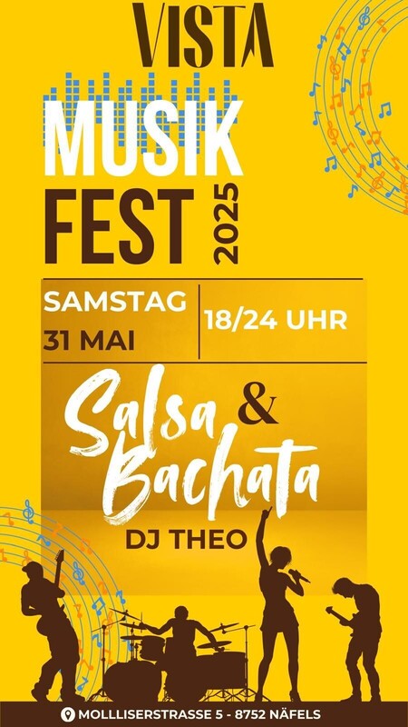 Samstag 31. Mai 2025 GRÖSSTE SALSA & BACHATA OPEN AIR IN GLARUS 6 Std. Top Musik mit DJ Theo 250 m2 Tanzparkett / 18 Uhr bis 24 Uhr 18:30h. Salsa Workshop mit Tiago & Team (Vive Bailando Tanzschule Zürich) Eintritt Genügend kostenlose Parkplätze vorhanden. VISTA BAR Molliserstrasse 5 8752 Näfels (Glarus) https://fb.me/e/5Pvg2Hm57