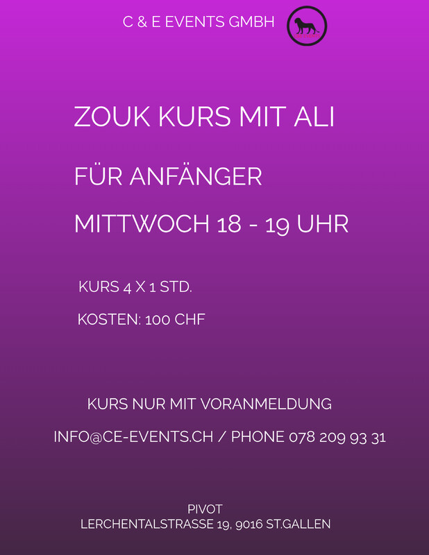 Wir starten unseren Brasilien Zouk Kurs mit Ali jeden Mittwoch Dauer: 4 Wochen Zeit : 19 - 20 Uhr Ort: Pivot , St. Gallen Kurs Kosten: 4x 1 Std. CHF 100.-- Anmeldung: unter 078 209 93 31 oder per mail: info@ce-events.ch Zielgruppe: Anfänger ohne oder mit Vorkenntnissen. Einzel oder paar Anmeldungen möglich, bitte genug früh anmelden, damit wir die Balance, Leader, Follower in einem akzeptablen Rahmen halten können. Der Kurs findet ab 4 Teilnehmern statt. Zouk Hug 🫂 Wir freuen uns auf schöne Kursabende mit euch! www.ce-events.ch