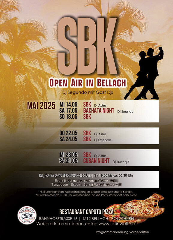 ⚠️ Der Event findet nur bei schönem Wetter statt. 👈🏽 🔥 Frühlings-Salsa und Bachata unter freiem Himmel! 🔥 Damit wir das beste Frühlingswetter nutzen, starten wir früher, ab *19:00 Uhr* geht’s los! 🕠💃🕺 Wir tanzen, solange es draussen angenehm ist – spätestens jedoch bis *23:30 Uhr*. 🌡️ *"Solange die Temperatur mitspielt, halten wir die Tanzfläche heiss!"* Also kommt vorbei, geniesst den Abend und lasst uns gemeinsam die Tanzfläche zum Glühen bringen! 🔥🎶 *PS: Bei unerwarteten Wetteränderungen checkt bitte kurz unsere Kanäle.* es wird immer ab 13.00 Uhr kommuniziert, ob die Party stattfindet oder nicht. Latinwelt präsentieren: ★SBK OPEN AIR PARTY IN BELLACH Tanzfläche Dj Segundo & Friends Salsa, Bachata, Merengue, Cha cha, Kizomba, Son! Zeit zum Geniessen! Zeit zum Feiern! ★Zeit: 19.00 Uhr bis 23:30 Uhr Party ★Preis: CHF 10.- Eintritt Party ★Informationen: - Tanzboden - Essen: Pizza, Pasta, Grill... - Der Event findet nur bei schönem Wetter statt. - 15 Minuten zu Fuss vom bahnhof Bellach - 5 Minuten mit dem Auto von Solothurn - genug Parkplätze vor Ort weitere Informationen unter www.latinwelt.net Anmeldung nicht zwingend.