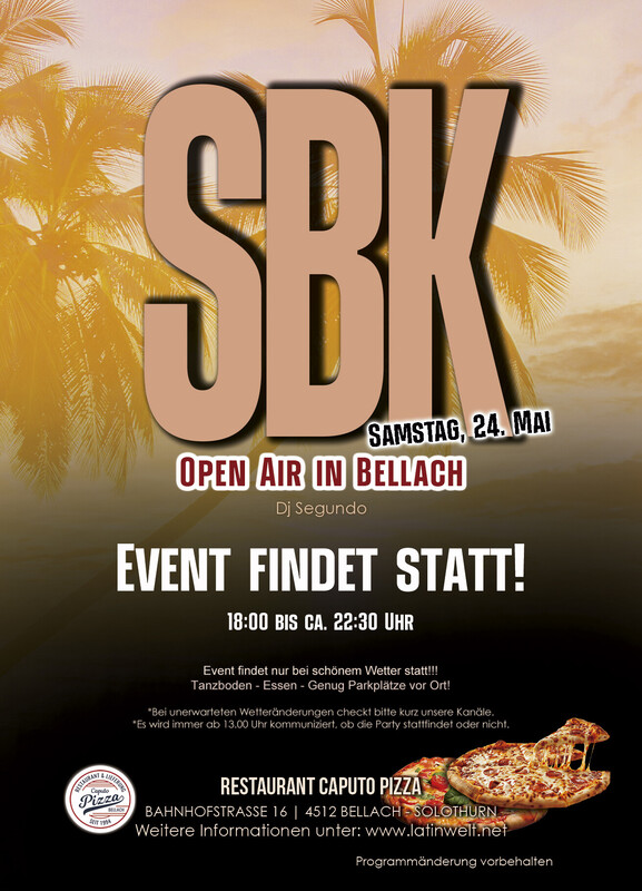 ⚠️ Der Event findet heute statt. 👈🏽 🔥 Frühlings-Salsa und Bachata unter freiem Himmel! 🔥 Damit wir das beste Frühlingswetter nutzen, starten wir früher, ab *18:00 Uhr* geht’s los! 🕠💃🕺 Wir tanzen, solange es draussen angenehm ist – spätestens jedoch bis *22:30 Uhr*. 🌡️ *"Solange die Temperatur mitspielt, halten wir die Tanzfläche heiss!"* Also kommt vorbei, geniesst den Abend und lasst uns gemeinsam die Tanzfläche zum Glühen bringen! 🔥🎶 *PS: Bei unerwarteten Wetteränderungen checkt bitte kurz unsere Kanäle.* es wird immer ab 13.00 Uhr kommuniziert, ob die Party stattfindet oder nicht. Latinwelt präsentieren: ★SBK OPEN AIR PARTY IN BELLACH Tanzfläche Dj Segundo & Friends Salsa, Bachata, Merengue, Cha cha, Kizomba, Son! Zeit zum Geniessen! Zeit zum Feiern! ★Zeit: 18.00 Uhr bis 22:30 Uhr Party ★Preis: CHF 10.- Eintritt Party ★Informationen: - Tanzboden - Essen: Pizza, Pasta, Grill... - Der Event findet nur bei schönem Wetter statt. - 15 Minuten zu Fuss vom bahnhof Bellach - 5 Minuten mit dem Auto von Solothurn - genug Parkplätze vor Ort weitere Informationen unter www.latinwelt.net Anmeldung nicht zwingend.