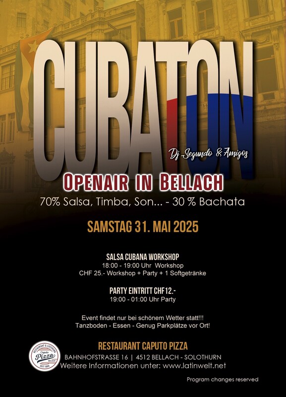 ⚠️ Der Event findet nur bei schönem Wetter statt. 👈🏽 🔥 Frühlings-Salsa und Bachata unter freiem Himmel! 🔥 Damit wir das beste Frühlingswetter nutzen, starten wir früher, ab *19:00 Uhr* geht’s los! 🕠💃🕺 Wir tanzen, solange es draussen angenehm ist – spätestens jedoch bis *01:00 Uhr*. 🌡️ *"Solange die Temperatur mitspielt, halten wir die Tanzfläche heiss!"* Also kommt vorbei, geniesst den Abend und lasst uns gemeinsam die Tanzfläche zum Glühen bringen! 🔥🎶 *PS: Bei unerwarteten Wetteränderungen checkt bitte kurz unsere Kanäle.* es wird immer ab 13.00 Uhr kommuniziert, ob die Party stattfindet oder nicht. Latinwelt präsentieren: ★SALSA CUBANA🇨🇺 OPEN AIR PARTY IN BELLACH 70% Salsa, 30% Bachata, Tanzfläche! Dj Segundo & Friends Zeit zum Geniessen! Zeit zum Feiern! ★Zeit: 18:00 - 18:50 Uhr | Salsa Cubana Workshop 19:00 - 01.00 Uhr Party ★Preis: CHF 12.- Eintritt Party CHF 25.- Workshop + Party + 1 Softgetränk ★Informationen: - Tanzboden - Essen: Pizza, Pasta, Grill... - Der Event findet nur bei schönem Wetter statt. - 15 Minuten zu Fuss vom bahnhof Bellach - 5 Minuten mit dem Auto von Solothurn - genug Parkplätze vor Ort weitere Informationen unter www.latinwelt.net Anmeldung nicht zwingend.