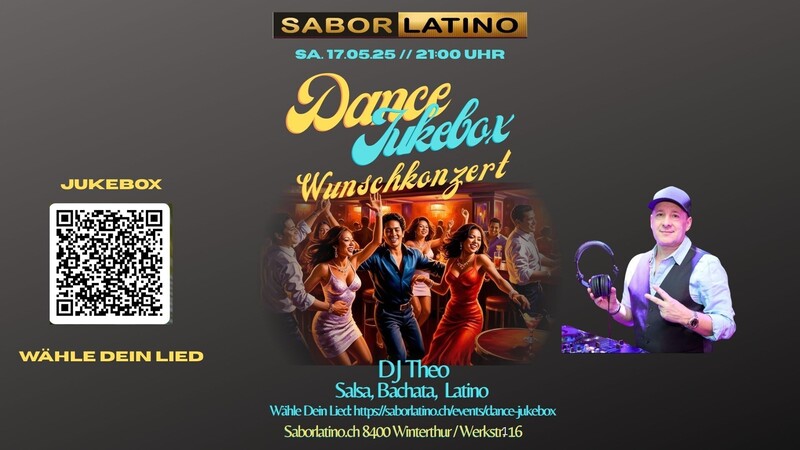 Dance Jukebox mit Wunschkonzert! Etwas Neues im Sabor Latino! Wünsch Dir Dein Lieblingslied, Salsa oder Bachata – wir spielen es! Stimme ab, tanze los und geniesse einen Abend ganz nach Deinem Musikgeschmack. Unser DJ bringt Deine Favoriten auf die Tanzfläche. Verpass diesen besonderen Event nicht! Floor 1:DJ Theo: Salsa, Bachata y mas Floor 2: DJ Eve Westcoastswing Wähle hier Dein Lieblingslied: https://forms.cloud.microsoft/r/D9xLptR25e
