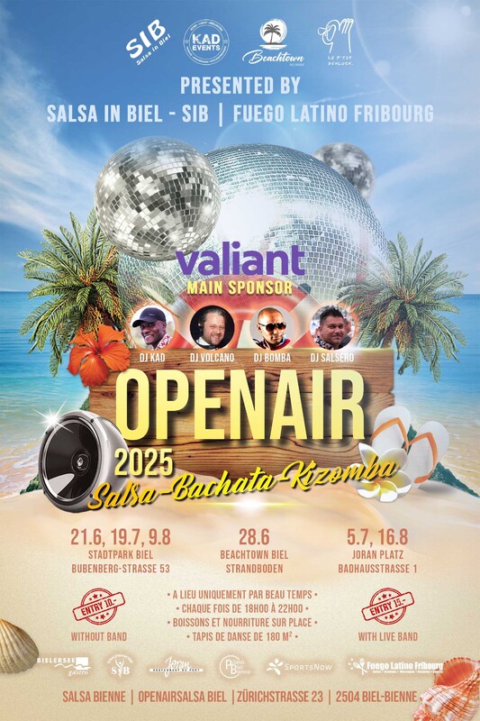 Wir sind begeistert, euch mitteilen zu dürfen, dass das jährliche Openair Salsa dieses Jahr wieder stattfinden wird! Doch das ist noch nicht alles - wir haben neu dieses Jahr 3 verschieden Standorte! Es wird eine grossartige Gelegenheit sein, unter freiem Himmel zu tanzen, die pulsierenden Rhythmen der SBK-Musik zu geniessen und gemeinsam unvergessliche Momente zu erleben. Egal, ob ihr Anfänger seid oder schon erfahrene Tänzer, unsere Veranstaltungen sind für alle geeignet, die die Leidenschaft für Salsa, Bachata und Kizomba teilen. Wir freuen uns schon jetzt darauf, euch zahlreich wieder an unserem Openair Salsa in Biel willkommen zu heissen. Lasst uns gemeinsam die Tanzfläche zum Beben bringen und eine unvergessliche Zeit erleben! Wir sind stolz anzukündigen, dass die DJ Kad, DJ Volcano, DJ Bomba und DJ Salsero erneut die Bühne rocken werden! Mit ihrer einzigartigen Auswahl an Songs und ihrem Talent, die Menge zum Tanzen zu bringen, werden sie die Nacht zum Leuchten bringen. Lasst uns gemeinsam die Magie des Salsa, Bachata und Kizomba erleben und die schöne Sommerzeit geniessen! Wir freuen uns darauf, euch zahlreich bei unserem Openair Salsa in Biel willkommen zu heissen. 🎶💃🕺 Daten: 21.6, 19.7, 9.8.2025 - Stadtpark Biel Adresse: Bubenberg-Strasse 53, 2502 Biel GOOGLE MAP Daten: 28.6.2025 - Beachtown Adresse: Strandboden, 2500 Biel GOOGLE MAP Daten: 5.7, 16.8.2025 - Joran Platz Adresse: Badhausstrasse 1, 2503 Biel GOOGLE MAP Eintritt: CHF 10.- ohne Liveband | CHF 15.- mit Liveband ----- 🇫🇷 🇫🇷 🇫🇷 🇫🇷 ----- Nous sommes ravis de vous annoncer que l’Openair Salsa annuel aura de nouveau lieu cette année ! Et ce n’est pas tout — pour la première fois, nous avons trois lieux différents! Ce sera une occasion exceptionnelle de danser en plein air, de profiter des rythmes vibrants de la musique SBK (Salsa, Bachata, Kizomba) et de partager ensemble des moments inoubliables. Que vous soyez débutants ou danseurs expérimentés, nos événements sont ouverts à tous ceux qui partagent la passion de la Salsa, de la Bachata et de la Kizomba. Nous nous réjouissons déjà de vous accueillir nombreux à l’Openair Salsa de Bienne. Ensemble, faisons vibrer la piste de danse et vivons des instants mémorables ! Nous sommes fiers d’annoncer que DJ Kad, DJ Volcano, DJ Bomba et DJ Salsero enflammeront à nouveau la scène ! Avec leur sélection unique de morceaux et leur talent pour faire danser la foule, ils illumineront la soirée. Venez partager avec nous la magie de la Salsa, de la Bachata et de la Kizomba et savourons ensemble la belle saison estivale ! Nous avons hâte de vous retrouver nombreux à notre Openair Salsa à Bienne. 🎶💃🕺 Dates: 21.6, 19.7, 9.8.2025 - Parc municipal Bienne Adresse: Bubenberg-Strasse 53, 2502 Bienne GOOGLE MAP Dates: 28.6.2025 - Beachtown Adresse: Sol de la plage, 2500 Bienne GOOGLE MAP Dates: 5.7, 16.8.2025 - Place du Joran Adresse: Badhausstrasse 1, 2503 Bienne GOOGLE MAP Entrée: CHF 10.- sans Liveband | CHF 15.- avec Liveband --- MAIN SPONSORS: Valiant CO SPONSORS: SportsNow, Pilates Biel GmbH PARTNER: Bielersee Gastro, Joran Restaurant, Beachtown, Le p’tit Schluck Homepage: www.openairsalsa-biel.ch | www.salsainbiel.ch Facebook: https://www.facebook.com/openairsalsa | https://www.facebook.com/profile.php?id=100015507362841 Instagram: https://www.instagram.com/salsainbiel/ | https://www.instagram.com/fuego_latino_fribourg/