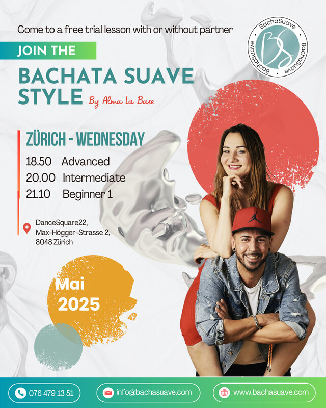 Feel the music. Dance the passion. Bachata Suave Style in Zürich! Erlebe den Rhythmus, die Verbindung und die Freude am Tanzen – direkt im Herzen von Zürich. Komm mit oder ohne Partner – und finde deinen Flow auf der Tanzfläche! Jeden Mittwoch – DanceSquare22, Max-Högger-Strasse 2, 8048 Zürich • 18:50 Uhr – Advanced • 20:00 Uhr – Intermediate • 21:10 Uhr – Beginner 1 Ob du neu einsteigst oder schon Erfahrung mitbringst – bei uns findest du die passende Klasse und ein inspirierendes Umfeld. Jetzt Platz sichern & mittanzen: www.bachasuave.com WhatsApp: 076 479 13 51 | E-Mail: info@bachasuave.com www.bachasuave.com