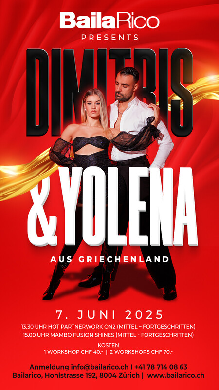 🔥 Finally back in Switzerland! 🔥 Dimitris & Yolena – direkt aus Griechenland in Zürich! Nach langer Zeit endlich wieder live bei uns: Dimitris & Yolena – ein Duo mit Power. Dimitris bringt nicht nur jahrelange internationale Erfahrung mit, sondern auch einen einzigartigen Stil, der Technik und Ausdruck auf ein neues Level hebt. Wann? 🗓 Freitag, 7. Juni 📍 Tanzschule Bailarico, Zürich Was dich erwartet: 💥 Hot Partnerwork On2 – Stylisch, klar & kreativ. 🔥 Mambo Fusion Shines – Power, Footwork & Attitude. Ob du deinen Style upgraden oder deine Partnerarbeit auf das nächste Level bringen willst – this is your chance. Direkt, inspirierend, intensiv. 👉 Die Plätze sind limitiert – jetzt anmelden und Spot sichern! Let’s dance, let’s sweat, let’s grow – together with Dimitris & Yolena. 🇬🇷💃🏽🕺🏽 Infos und Anmeldung unter: info@bailarico.ch oder +41 78 714 08 63 www.bailarico.ch