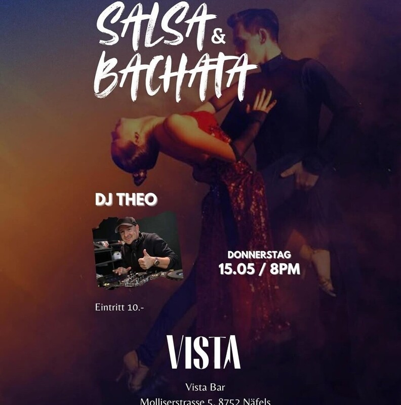Donnerstag 15. Mai ★ SALSA & BACHATA ★ Party mit DJ Theo 20.00 Uhr bis 23.59 Uhr Eintritt 10.- Genügend kostenlose Parkplätze vorhanden. VISTA BAR Molliserstrasse 5 8752 Näfels (Glarus) Weitere infos: www.vista-bar.ch https://www.facebook.com/vistabarCH https://fb.me/e/5ClQ348vx