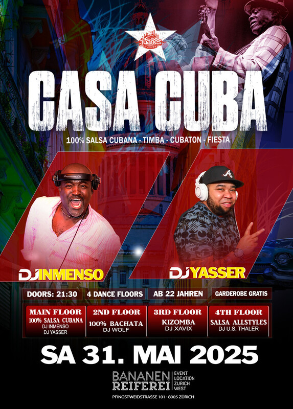 ★ CASA CUBA ★ 100% Cubano DJs Inmenso & Yasser 4 Dance Floors Bananenreiferei SAMSTAG 31. MAI 2025 ●●●● ★ 4 Dance Floors ★ AB 22 JAHREN ★ DOORS: 21:30 – 04:00 UHR ★ EINTRITT CHF 20.- ★ GRATIS GARDEROBE ★ 400 AUTO PARKPLÄTZE ★ EINTRITT: BEZAHLUNG AN DER KASSE NUR BARGELD ★ GETRÄNKE-BAR: BARGELD & CREDITCARD ●●●● VERLOSUNG: . 2X TICKETS LEONI TORRES 12.07.25 AURA CLUB Zürich . 5x TICKETS SALSA WHITE PARTY 07.06.25 AURA CLUB Zürich ●●●● ★ 1-MAIN FLOOR: * 100% CUBANO ★ DJ INMENSO ★ DJ YASSER 100% Salsa Cubana, Timba – Rumba - Fiesta ●●●● ★ 2ND FLOOR: BACHATA: ★ DJ WOLF 100% Bachata Fusion, Moderna, Clasica, del Recuerdo ●●●● ★ 3RD FLOOR: KIZOMBA: ★ DJ XAVIX Kizomba - Semba - Tarraxinha - Afrohouse - Urban Kiz ●●●● ★4TH FLOOR: SALSA ALLSTYLES ★ DJ U.S. THALER Salsa Allstyles, Puertorriqueña, Clasica, Mambo. ●●●● BANANENREIFEREI Pfingstweidstrasse 101 8005 Zürich ★★★ Bienvenidos Juanes Events https://juanesevents.ch/ https://juanesevents.ch/2-0-Events.html
