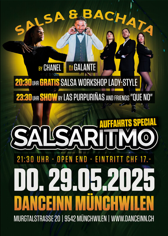🔥SALSARITMO🔥 Die beliebte SALSA & BACHATA Party der Ostschweiz🥳. Geniesse das einzigartige Ambiente und die tolle Stimmung im DanceInn Münchwilen💃🏻🕺🏾♥️.. 🔘20:30H - 21:30H Gratis Workshop SALSA LADY-STYLE💃🏻 by CHANEL👏 🔘21:30H - Open End, Party & Tanzen bis in die Morgenstunden🥂.. 🔘23:30H SHOW by LAS PURPURIÑAS AND FRIENDS "QUE NO"💥 🔘DJ: GALANTE🎧 Wir freuen uns auf einen coolen SALSA LADY-STYLE Workshop by CHANEL, einer absoluten Super Tänzerin💃🏻, auf eine Mega SHOW sowie auf unsere tollen Gäste🥰..