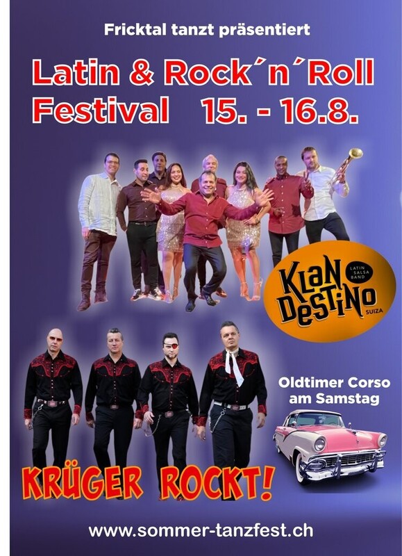 Latin Live Band am Freitag Outdoor und Latin Night mit einem Bachata Floor und einem Salsa Floor Indoor. Am Samstag Oldtimer Corso, Rock'n'Roll Live Band Outdoor & Fricktal tanzt auf 2 Floors Indoor. Herzlich willkommen beim Latin & Rock'n'Roll Festival von Fricktal tanzt. Zwei super Tage mit einem spannenden und sehr abwechslungsreichen Programm auf der Outdoor und Indoor Eventfläche. Euch erwartet eine grosse Outdoor Festwirtschaft mit über 300 Sitzplätzen und eine knapp 100m grosse Outdoor Tanzfläche. Der Zugang zum Outdoor Bereich mit den Live Bands ist dank unserer super Sponsoren komplett kostenlos. Outdoor gibt es Live Bands an beiden Tagen. - Am Freitag mit der 9-köpfigen Latin Band "Klan Destino Suiza" - Am Samstag heizen die Jungs von "Krüger Rockt!" mit ihrer Rock'n'Roll Show ein Am Samstag Nachmittag findet ausserdem der 5. Oldtimer Corso durch die Rheinfelder Altstadt statt. Neu haben wir eine grosse Ausstellungsfläche direkt im Umfeld des AUREA. So können die schönen Autos noch besser angeschaut werden. Die Ausstellung beginnt bereits ab 14.00 Uhr und dauert bis ca. 18.00 Uhr Am Freitag geht die Latin Party ab 22.30 bis 02.00 Uhr Indoor weiter. Mit einem Salsa und einem Bachata Floor kann bis 02.00 Uhr zum Sound von DJane Miha (Bachata) und DJ Toni (Salsa) weiter getanzt werden. Am Samstag läuft das Stammformat "Fricktal tanzt" mit DJ 43 und Paartanz vom Feinsten auf zwei Tanzflächen. Unbedingt Vorverkauf nutzen. Das Team vom Party Service Pelaez Rheinfelden wird für das leibliche Wohl sorgen. Details folgen asap. Alle Programm Highlights findet ihr unter https://www.sommer-tanzfest.ch Trotz der Sponsoren ist dieser Event für den Verein auch finanziell ein grosser Brocken. Daher führen wir auf freiwilliger Basis das Solidaritätsticket ein. Damit kannst du etwas für das Outdoor Programm beisteuern. Wir danken dir bereits heute dafür. Also, auf bald und stay tuned! Liebe Grüsse Fricktal tanzt Outdoor kostenlos Dank den Sponsoren. Outdoor Solidaritätsticket für CHF 20.00 Indoor pro Abend: CHF 15.00 pro Person https://www.aurea-events.ch
