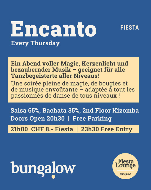 Jeden Donnerstag lädt "ENCANTO" zu einer bezaubernden Fiesta ein, bei der Salsa und Bachata die Tanzfläche zum Leben erwecken! Bei viel Kerzenschein bieten wir eine magische Nacht im Bungalow voller schöner Musik. Zudem gibt es einen «Kizomba-Floor» im Bungalito! Perfekt für Tanzanfänger sind «Taxi-Dancers» anwesend, welche dich in der ersten Stunde der Fiesta unterstützen und mit dir tanzen. Neu sind wir bereits ab 20:30 Uhr für dich da! Erlebe unvergessliche Momente, das ganze Jahr, ohne Winter- & Sommerpause, in einer zauberhaften Atmosphäre. www.bungalow-bienne.ch