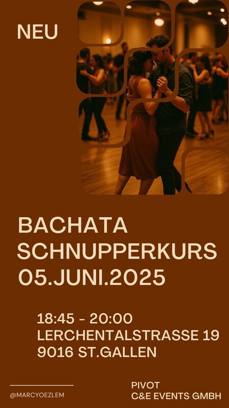 Bachata Tanzkurs in St. Gallen – Jetzt Schnupperstunde buchen! Am 05. Juni 2025 startet unser neuer Bachata Tanzkurs für Anfänger in St. Gallen! Du möchtest Bachata tanzen lernen, ganz ohne Vorkenntnisse? Dann ist dieser Kurs genau das Richtige für dich! Was dich erwartet: • Schnupperstunde: kostenlos und unverbindlich • Danach: 8 Wochen Bachata Kurs für nur 200 CHF pro Person • Ort: Lerchentalstrasse 19, 9016 St. Gallen • Zeit: 18:45 – 20:00 Uhr Für wen ist der Tanzkurs geeignet? • Anfänger ohne Tanzerfahrung • Einzelpersonen & Paare • Alle, die Spaß an Musik und Bewegung haben Warum Bachata? • Einfache Schritte, schnelle Fortschritte • Perfekt für Einsteiger • Leidenschaftlicher Tanzstil aus der Dominikanischen Republik Jetzt Platz sichern für die kostenlose Probestunde! Anmeldung: info@ce-events.ch oder Phone: 078 209 93 31 Wir freuen uns auf euch !!! www.ce-events.ch