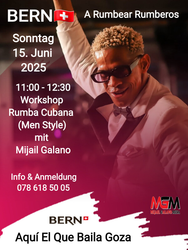 Sonntag in Bern 11:00 - 12:30 Workshop Rumba Cubana Men Style Imfo & Anmeldung 078 618 50 05 Aquí El Que Baila Goza www.mijailgalano.ch