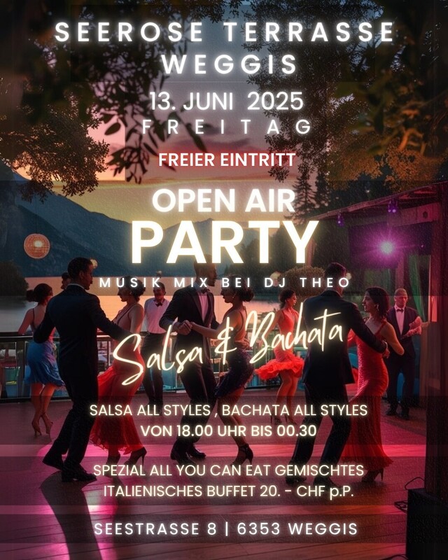 FREITAG 13. JUNI Salsa, Bachata, Sunset & Gemischtes Buffet mit Mediterraner und Italienischer Küche "á Discretion" auf der einzigartigen Terrasse Seerose am See in Post Hotel Weggis. PROGRAMM: 18h. bis 21h. Unser Top Angebot "All you can Eat" so viel du essen magst GEMISCHTES BUFFET MIT MEDITERRANER UND ITALIENISCHER KÜCHE Á DISCRETION Sowie Pasta mit unseren Zwei verschiedenen Top Qualität Standardsaucen. Pro Person NUR 20.- Reservation unter: Tel. +41 41 392 25 25 info@post-hotel-weggis.ch 18h. bis 00:30h & Frei Eintritt SALSA & BACHATA OPENAIR PARTY MIT DJ THEO Weggis «Perle der Schweizer Riviera» Grosse Dance Floor und nur 50m entfernt von Pavillon am See. Salsa, Bachata von 19 Uhr bis 00.30 Uhr werden von DJ Theo gespielt auf der Terrasse des Post Hotels in Weggis im Restaurant Seerose. Freier Eintritt und direkt im Zentrum bei der Schiffstation Weggis TERRASSE RESTAURANT SEEROSE, direkt am See mit Blick auf das traumhafte Alpenpanorama. POST HOTEL WEGGIS Seestrasse 8, 6353 Weggis Web: https://www.post-hotel-weggis.ch/seerose https://www.facebook.com/hotelrestaurantpohoweggis/ https://fb.me/e/35X3Wc4jI