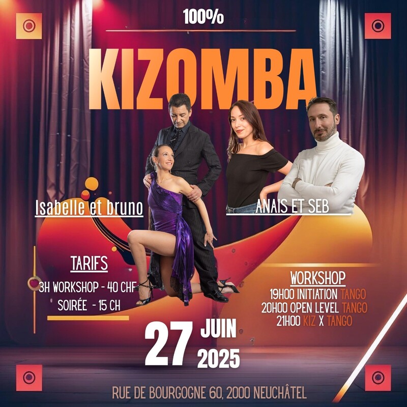 🎊 LA MENSUELLE (SPÉCIALE 😊) 🔵 SOIREE KIZOMBA // WORKSHOP TANGO & URBAN KIZ avec ISABELLE & BRUNO de France! 📅 VENDREDI 27 JUIN 2025 19h - 20h Initiation Tango 20h - 21h Open Level 21h - 22h Urban Kiz (transposition des figures tango en kiz) 22h - 02h Soirée 100% Kizomba avec Dj Colada❤️‍🔥 🔵 Pour cette soirée mensuelle nous vous proposons une spéciale: une soirée 100% KIZOMBA qui démarrera avec des workshops de TANGO afin de s’inspirer de certains concepts clés de cette danse applicables à la Kiz et Urban Kiz. Isabelle et Bruno, deux danseurs professionnels français diplômés de l’AMDF viendront nous enseigner leurs techniques. TARIFS: 3h de workshops + soirée: 40 CHF Soirée: 15 CHF Il est conseillé de participer aux 2 premiers workshops pour pleinement profiter du 3ème, qui sera l’application des concepts tango en Kizomba. Viens profiter des workshops et/ou de la soirée à Corazon Latin Dance! 📍 Rue de Bourgogne 60, 2000 Neuchâtel ☑️ Pas d’inscription nécessaire ☑️ Tarif spécial pour workshops ☑️ Bar à cocktails ouvert dès 21h00 Si tu as des questions écris-nous en mp, toute l’équipe du Studio Flow est à ta disposition 🤗
