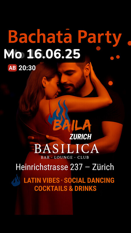 Mo.16.06.25 Bachata PARTY 🆎 20:30 DJ Baila Basílica Heinrichstrasse 237,ZH https:// maps.app.goo.gl/MDVjPNnyaK13xonm7?g_st=com.google.maps.preview.copy https://www.instagram.com/baila_zurich?igsh=ZXYyZXloM2Y2ajM3 https://chat.whatsapp.com/CqlnvN6shs695Nn5JxmZ4h