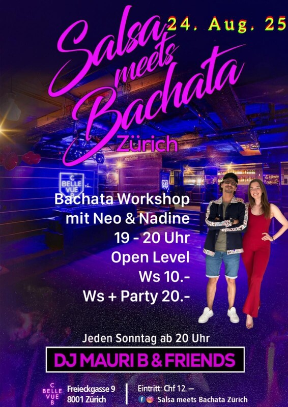 Salsa meets Bachata - Zürich Es wird heiss wenn diese zwei Rhythmen aufeinander treffen. Ein Abend vollgepackt mit dem besten, angesagtesten Sound dieser zwei Stile - da kann niemand mehr ruhig sitzen. Ganz nach dem Motto: BEST MUSIC, ONLY KILLER, NO FILLER ! Salsa und Bachata - all styles Bachata Open Level Ws 10.- / Ws + Party 20.- Start Workshop: 19 Uhr Start Party: 20 Uhr Dj Mauri B fb & insta: Salsa meets Bachata Zürich Zahlungsmittel: Bar / Kreditkarten / Twint
