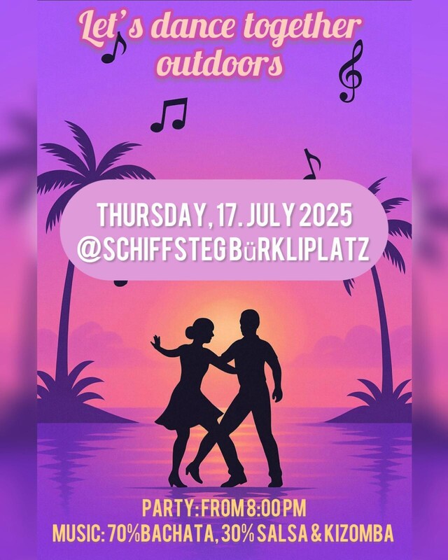 Let's dance together tonight :) As always @Schiffsteg Bürkliplatz, Zürich From 8.00 PM Today we play 70% Bachata, 30% Salsa and Kizomba We look forward to dance together. See you there :) If you want, feel free to join our Whatsapp group: https://chat.whatsapp.com/JqacpvYeUL51fJfvgsrZeX