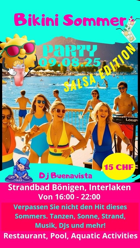 Salsa in der Sonne in Interlaken! Bereite dich auf ein fröhliches Lächeln und deine Freude ein. Die Sonne, der pulsierende Salsa-Rhythmus in der Luft, du tanzt am See, nimmst ab und zu ein Bad, die Schweizer Alpen im Hintergrund. Das ist nicht nur eine Party; es ist Musik, Tanz, Natur und pure Energie. Bist du bereit für einen unvergesslichen Tag, an dem die Leidenschaft des Salsa auf die Schönheit der Schweiz trifft? Wir erwarten dich! ¡Salsa al Sol en Interlaken! Prepara tu alegría y tu mejor sonrisa. El sol, el ritmo vibrante de la salsa llenando el aire, ,tu bailando junto al lago, de vez en cuando te das un baño, los Alpes suizos como telón de fondo. Esta no es solo una fiesta, es Música, baile, naturaleza y la energía más pura. ¿Estás listo para vivir un día inolvidable donde la pasión de la salsa se encuentra con la belleza de Suiza? ¡Te esperamos!