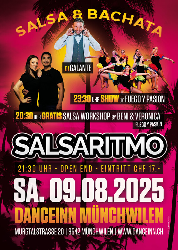 🔥SALSARITMO🔥 Die beliebte SALSA & BACHATA Party der Ostschweiz🥳. Geniesse das einzigartige Ambiente und die tolle Stimmung im Dance Inn Münchwilen💃🏻🕺🏾♥️.. 🔘20:30H - 21:30H Gratis SALSA Workshop by BENI & VERONICA FUEGO Y PASION💃🏻🕺 🔘21:30H - Open End, Party & Tanzen bis in die Morgenstunden🥂.. 🔘23:30H SHOW FUEGO Y PASION LADIES💥 🔘DJ: GALANTE🎧 Wir freuen uns auf einen coolen SALSA Workshop mit BENI & VERONICA, auf eine Super SHOW von FUEGO Y PASION LADIES sowie eine tolle Party🥳🥂..
