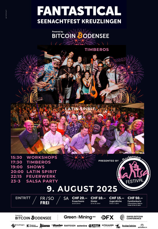 Salsa, Bachata und Kizomba am Fantastical in Kreuzlingen fantastical.ch 9. August 2025 ab 15 Uhr am FANTASTICAL Seenachtsfest mit Feuerwerk in Kreuzlingen auf der Alleebühne organsiert vom Salsa Tanzverein Kreuzlingen. Workshops, zwei Salsa Big Bands - Timberos und Latin Spirit, Shows und Salsa, Bachata und Kizomba Party stehen auf dem Programm! Come on and dance. https://salsafestival-bodensee.ch