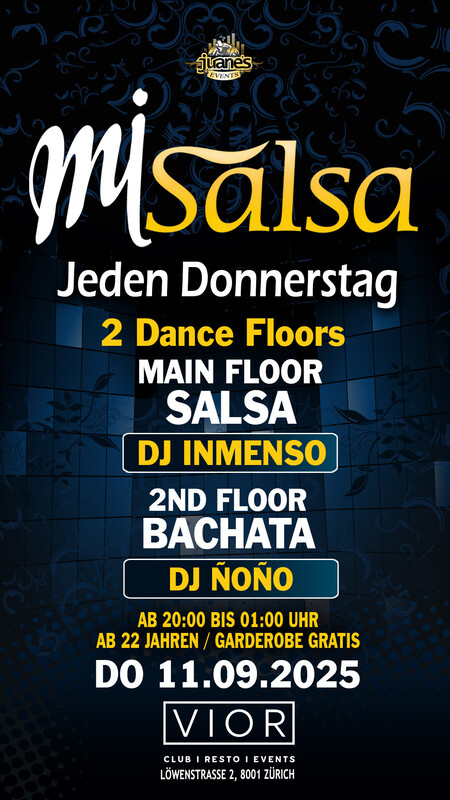 ► MI SALSA ◄ Jeden Donnerstag 2 Floors VIOR CLUB DONNERSTAG 11. SEPT. 25 ••• ► MAIN FLOOR: SALSA ALLSTYLES DJ INMENSO • Salsa Allstyles - Cubana - Clasica - Puertorriqueña •••• ► 2ND FLOOR: BACHATA DJ ÑOÑO • Bachata Moderna, Fusion, Clasica y del Recuerdo. •••• Gutschein im Wert von CHF 5.- für Dich für die Party am Samstag ... .. bei ....... der Bananenreiferei •••• • 2 Grosse Tanzflächen • Grosse Salsa Floor • Grosse Bachata Floor • Doors: 20:00 bis 01:00 Uhr • Garderobe Gratis • Eintritt Party CHF 10.- Inkl. Garderobe •••• • EINTRITT: BEZAHLUNG AN DER KASSE NUR BARGELD. •••• BACHATA FLOOR: Die Bachata-Tanzfläche befindet sich im Untergeschoss, es ist eine grosse und gemütliche Tanzfläche für die Bachata-Tänzer. •••• GARDEROBE: Die Garderobe befindet sich im Untergeschoss, neben der Bachata-Tanzfläche (Garderobe ist gratis). •••• AUDIO TON: Das Audio ist perfekt, professioneller Sound eines echten Clubs. •••• Location: VIOR CLUB Löwenstrasse 2 8001 Zürich •••• SEARCH MAP https://map.search.ch/Z%C3%BCrich,L%C3%B6wenstr.2 •••• Bienvenidos Mi Salsa by Juanes Events. https://juanesevents.ch/2-0-Events.html https://juanesevents.ch/2-0-Events.html