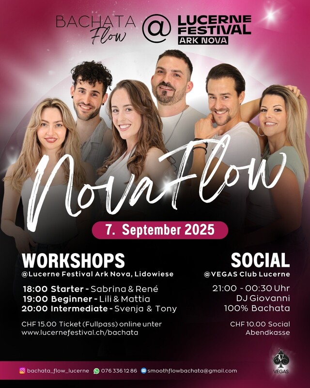 Nova Flow bei Lucerne Festival🌊🐚 Am *Sonntag, 7. September 2025* tanzen wir auf einer ganz besonderen Bühne des Lucerne Festivals: der *Ark Nova* – ein riesiges, leuchtendes Schneckenhaus, eine einzigartige mobile Konzerthalle. Nun kommt dieses aussergewöhnliche Kunstobjekt mitten ins Herz der Schweiz mit einem Programm, das Menschen, Musik und Architektur in einzigartiger Weise verbindet. Entdecke mehr dazu: www.arknova.ch *Lucerne Festival* ist berühmt für klassische Musik auf höchstem Niveau – dieses Jahr wird zum ersten Mal auch Bachata getanzt! 💃🏻 Drei *Bachata-Workshops* 18:00 Uhr Starter Workshop mit Sabrina & René 19:00 Uhr Beginner Workshop mit Lili & Mattia 20:00 Uhr Intermediate Workshop mit Svenja & Tony 🥳 Ab 21:00 Uhr: *Bachata Social* mit DJ Giovanni im Vegas Club Luzern 🎟 *Tickets*: Fullpass (Workshops+Social) ab CHF 15.– online unter www.lucernefestival.ch/bachata Social: CHF 10.– an der Abendkasse Wir freuen uns riesig auf einen tollen Abend mit guter Stimmung, viel Tanz und tolle neue Begegnungen! 🩷 www.lucernefestival.ch/bachata