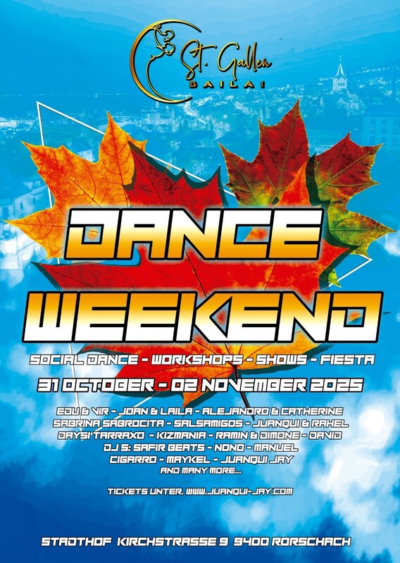 Herzlich Willkommen zu einer neuen Edition des SGB! DANCE WEEKEND am Bodensee. 31 Oktober - 02 November 2025 wird Rorschach nochmals zum Hotspot der Salser@s - Bachater@s - Kizomber@s 🔥 Kick-Off Party 31. Oktober Das SGB! DANCE WEEKEND startet mit einem Bootcamp voller Energie und einer explosiven Pre-Party im MIAMI CLUB in St. Gallen! Salsa, Bachata & Kizomba-Vibes, Cocktails & heißer Groove bis in die Nacht! 💥 Main Event 01 – 02 NovemberWillkommen im Tanzparadies direkt am Bodensee in Rorschach! 📚 Workshops mit Top-Artists 🎧 Nationale & Internationale DJs 💃 Socials 🎭 Animation & Stimmung pur 💃 Musik & Magie Animation Sichere dir jetzt dein Ticket und sei dabei, wenn Rorschach bebt! ★ TICKETS unter: www.juanqui-jay.com/danceweekend-tickets ★ WEITERE INFOS: www.juanqui-jay.com | info@juanqui-jay.com ★★★ LINE-UP ★★★ 💃✨✭ARTISTS✨🕺🏾 ▷ SALSA ⦿ Nacho & Belén (AR) 5 Times MAMBO WORLD CHAMPIONS Sabrina Sabrocita (AT) Alejandro & Catherine (RD | DE) Juanqui & Rahel (EC | CH) David (EC) Michele & Gülenay (IT | TK) to be confirmed ▷ BACHATA Edu & Vir (Sabor Dinamico ES) Joan & Layla (ES) David (EC) ▷ KIZOMBA & ZOUK Daysi Tarraxo (FR) Juanqui & Rahel (EC | CH) Kizmanie Dancers Team (FR) Ramin & Inna (DE) 🎧✨DJ'S✨🎧 Safir Beats (FR) Ñoño (CH) Maikel (CU) Cigarro (IT) Juanqui Jay (EC) More artists to be added... 🗓✨ PROGRAMM✨🗓 Freitag 31.10.2025 Miami Club St. Gallen 18:00 - 21:00 Workshops 21:00 - 01:00 Uhr SBK Party Samstag 01.11.2025 Stadthofsaal Rorschach 11:00 - 17:00 Uhr Workshops 17:00 - 20:00 Uhr Social Dancing 21:00 - 03:00 Uhr Party Sonntag 02.11.2025 Stadthofsaal Rorschach 11:00 - 16:00 Uhr Workshops 15:00 - 20:00 Matineé 👔✨ DRESSCODES✨ 👗 ⦿ Freitag: PYJAMA PARTY ⦿ Samstag: EGYPTIAN TOUCH ⦿ Sonntag: TWINS 🎟✨ PREIS VVK✨ 🎟 ▻ Fullpass die erste 20 Early Bird Passes CHF. 79 (bis 31.07.2025) ▻ Fullpass Preis CHF 119.- (der Preis steigt monatlich) ▻ Day Pass CHF. 69.- ▻ Dance & Fun Pass CHF. 55.- ★ ABENDKASSE ▻ Fullpass CHF 129.- ▻ Day Pass 79.- ▻ Dance & Fun Pass CHF. 55.- 📍✨VENUE✨📍 💥 KICK-OFF Miami Club St. Gallen Am Bohl 9 9000 St. Gallen 💥 MAIN EVENT Stadthofsaal Rorschach Kirchstrasse 9 9400 Rorschach SE FORMÓ EL RUMBÓN!!! SE FORMÓ EL RUMBÓN!!!