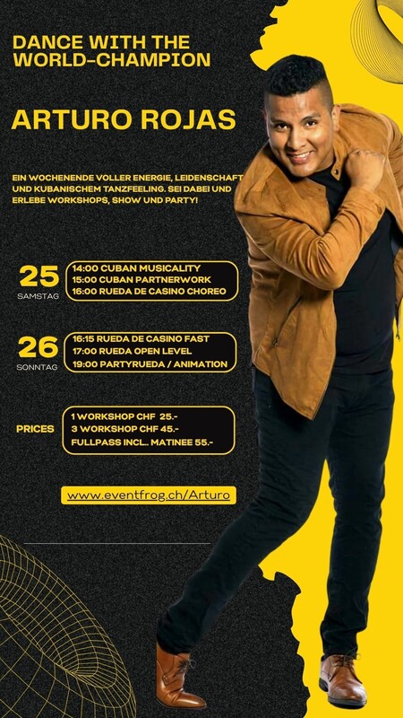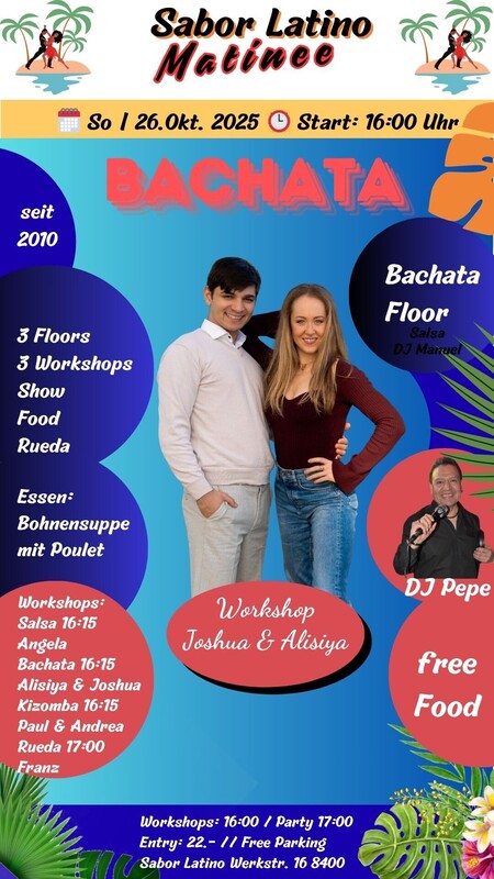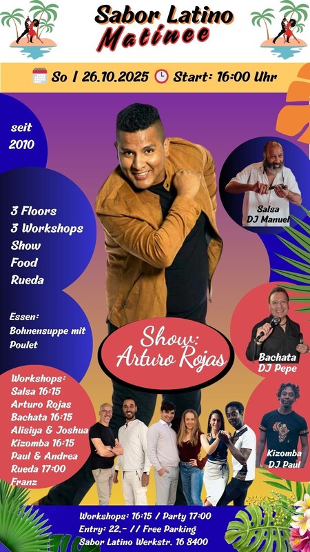SABOR LATINO MATINEE, seit über 10 Jahren die Party am Sonntagnachmittag für alle die Salsa, Bachata und Kizomba lieben. Hast du Lust auf eine Salsa, Bachata und Kizomba-Party, die dich zum Schwitzen bringt? Dann komm zum Sabor Latino Matinee! Hier gibt es nicht nur einen, sondern gleich zwei Dancefloors, auf denen du zu den heißen Rhythmen unserer DJ`s das Tanzbein schwingen kannst. Aber bevor du dich in das Party-Getümmel stürzt, hast du die Möglichkeit, bei einem Workshop deine Tanz-Skills zu verbessern. Unsere professionellen Tanzlehrer werden dir zeigen, wie du dich elegant auf dem Parkett bewegst und dabei eine Menge Spaß hast. Danach darfst du dein Können beim Rueda ausprobieren und dein Glück beim Tanzen in der Gruppe versuchen. Und wenn du zwischendurch eine Pause brauchst, kannst du Dir an der Bar einen feinen Cocktail gönnen und um 18:30 Uhr von den köstlichen Düften eines feinen Menus von unserem Kochverein el Tipico verführen lassen. Also komm vorbei und verbringe eine unvergessliche Zeit mit uns auf der Sabor Latino Matinee! Floor 1: DJ Manuel mit Salsa Floor 2: DJ Pepe Bachata Floor 3: DJ Paul Kizomba Liveact: Party Rueda & Animation mit dem Rueda Weltmeister Arturo Rojas Essen: Kochverein el Tipico 2 Workshops: 16:15 – 17:00 Uhr: - Kizomba: Paul & Andrea - Bachata: Joshua & Alisiya - Salsa: Arturo Rojas 17:00 – 17:30 Uhr Rueda Open mit Arturo Rojas Vor dem Sabor Latino stehen genügend gratis Parkplätze zur Verfügung. Anreise mit dem Auto: Wegbeschreibung: An – Abreise mit dem ÖV bis Werkstr. 16: Zum Fahrplan https://saborlatino.ch/events/sabor-latino-matinee-am-sonntagnachmittag/