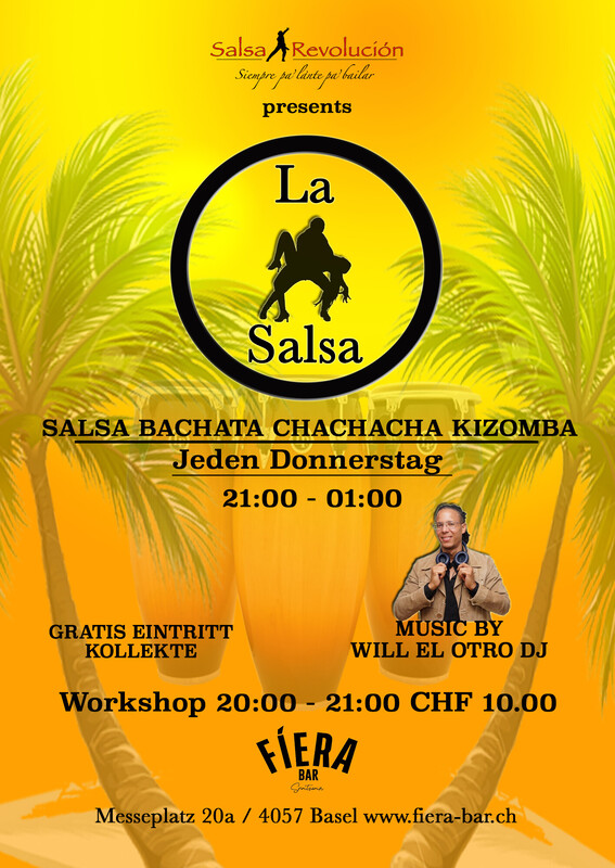 LA SALSA Neu in Basel Jeden Donnerstag LA SALSA: 21:00-01:00 Music by Will El Otro Dj Gratis Eintritt (Kollekte) Workshop: 20:00-21:00 Salsa Partnerwork 20 Plätze, obligatorische Anmeldung. Tel: 0041 76 470 79 52 CHF 10.00 p.P Wir LA SALSA freuen uns sehr, euch mitteilen, dass ab Donnerstag 14. August 2025, können jeden Donnerstag das neue Salsa Party in Basel „LA SALSA“ in die Fantastische Location (Fiera Bar)in Messeplatz geniessen. Wir LA SALSA freuen uns sehr, euch persönlich, Herzlich Willkommen zu heissen und auf die Fantastische Musik, Salsa Puertorriqueña, Bachata, CháCháChá, Salsa Cubana und noch mehr von unsere Einzigartige Will El Otro Dj, den ganze Nacht zu tanzen. Die Fiera Bar bereitet leckere Getränke und Cocktails zu, um eurem Durst zu stillen. Die Tramlinien Nr. 2,6,14,15 sind hervorragend erreichbar und bieten eine bequeme Anreise zur LA SALSA PARTY in Basel. Mit regelmässigen Verbindungen bringen sie euch direkt zu unserem Veranstaltungsort. So steht einem entspannten Abend voller Tanz und Spass nicht im Wege. Ven a bailar con nosotros Te esperamos. Für fragen und Anmeldung Yony 0041 76 470 79 52 https://www.salsarevolucion.com