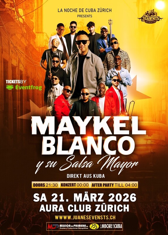 La Noche de Cuba Presents: ★ MAYKEL BLANCO Y SU SALSA MAYOR ★ Live in ZÜRICH ★ Sa 21. März 2026 AURA CLUB ●●●● La emblemática orquesta Maykel Blanco y Su Salsa Mayor regresa a Zúrich el sábado 21 de marzo de 2026 en el exclusivo AURA Club. Después de 4 años, el público suizo vuelve a recibir a La Mayor de Cuba, con su electrizante, enérgica y contagiosa presentación que hará vibrar a todos los salseros y cubanos en Suiza. La fusión de ritmos caribeños, el virtuosismo musical y la pasión que caracteriza a Maykel Blanco y Su Salsa Mayor convertirán este encuentro en una experiencia inolvidable, reafirmando el poder de la música como puente entre culturas. Con mucho amor y respeto, seguimos apoyando la Cultura Cubana en Suiza desde 2003 y en 2025 lo hacemos con la misma energía y compromiso. 🎶 ¡Prepárate para bailar y vivir una noche única con La Noche de Cuba! ●●●●● ★ EARLY-BIRD CHF 30.- (Valido hasta 01.02.26) https://eventfrog.ch/maykelblancozurich2026 (Early-Bird-Precio Especial valido hasta 01.02.26) ●●●●● ★ AB 01.02.26 VORVERKAFT - PREVENTA CHF 40.- ●●●●● ★ ABENDKASSE CHF 45.- ●●●●● ★ PARTY START@ AURA Club von 21:30 BIS 04:00 Uhr ★ DJ INMENSO DJ MANUEL ★ AB 20 JAHREN ★ KONZERT 00:00 UHR UND DAUER 90 MIN. + - ★ AB 01:30 AFTER PARTY DJs BIS 04:00 UHR ★ 100% Salsa Cubana, Timba, Cubaton, Fiesta ★ AB 01:30 UHR AFTER PARTY EINTRITT CHF 15.- ●●●● Eingang mit VORVERKAUFT Wir haben 2 Eingänge, um Ihnen einen schnellen und effizienten Eintritt zu ermöglichen ★ 2 Scanner mit Juanes Personal am Eingang ★ Die Garderobe ist im ersten Stock ★ Kontrolle des Tons und Umfangs angepasst, um ein gutes Konzert zu genießen. ★ Gehörschutz Stöpsel ●●●●● Das legendäre Orchester Maykel Blanco y Su Salsa Mayor kehrt am Samstag, 21. März 2026, in den exklusiven AURA Club Zürich zurück. Nach 4 Jahren erwartet das Zürcher Publikum endlich wieder La Mayor de Cuba – mit einer elektrisierenden, energiegeladenen und mitreißenden Show, die alle Salsafans und Kubaner in der Schweiz begeistern wird. Die Verschmelzung karibischer Rhythmen, musikalischer Virtuosität und der Leidenschaft, die Maykel Blanco y Su Salsa Mayor auszeichnet, macht diesen Abend zu einem unvergesslichen Erlebnis und bestätigt die Musik als Brücke zwischen Kulturen. Mit viel Liebe und Respekt unterstützen wir seit 2003 die kubanische Kultur in der Schweiz – und tun es auch 2025 mit derselben Energie und Hingabe. 🎶 Sei dabei und erlebe eine unvergessliche Nacht bei La Noche de Cuba! ●●●●● ORT: AURA CLUB Zürich Bleicherweg 5 8001 Zürich ●●●● ★ ANFAHRT ★ ✪ TRAM & BUS ► Weg zur AURA CLUB von Zürich (HB), mit dem Tram Nr. 4, 13, 11 bis PARADEPLATZ, 2Mint. zu Fuss bis Aura Club SEARCH PLAN: https://search.ch/.../AURA-Group-AG,Z%C3%BCrich... ●●●● ★ INFOS & KONTAKT ★ Telf: 079 344 50 92 Mail: juan@juanesevents.ch https://juanesevents.ch/2-0-Events.html