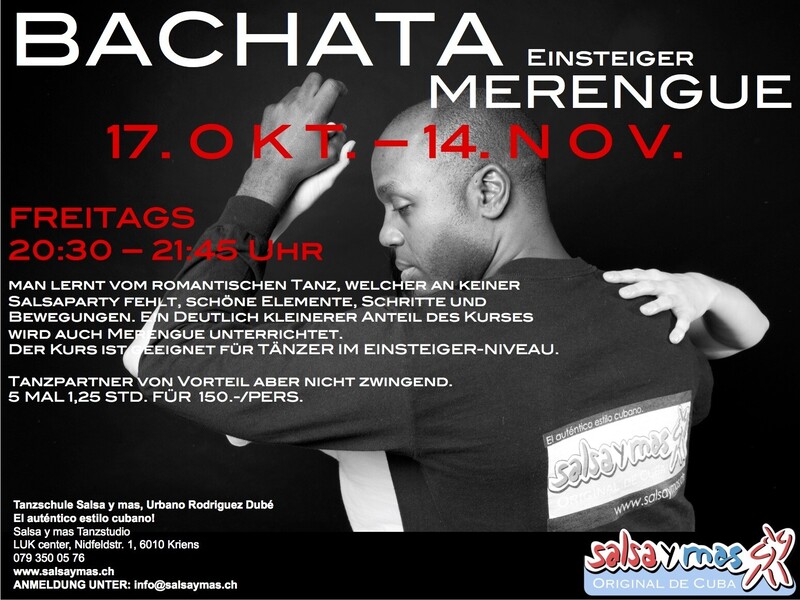 Bachata und Merengue Wochenkurs bei Salsa y mas, Luzern ab Freitag 17. Oktober 2025. (Ein Einstieg ist auch verspätet möglich! Der Preis wird dann entsprechend angepasst.) Lerne die beiden Tänze kennen, die an keiner Latinparty fehlen! Bei Urbano, dem sehr erfahrenen Tanzlehrer aus Kuba. In diesem Kurs lernt man verschiedene Bachataschritte, Bewegungsmuster und einfache Drehungen. Ein deutlich kleinerer Anteil wird auch Merengue unterrichtet. Kursdaten: Freitag, 17.10. – 14.11.2025 20:30 - 21:45 Uhr 5 mal 1,25 Std. für CHF 150.-/Pers. Kurslokal: Salsa y mas Tanzstudio, LUK Center, Nidfeldstrasse 1, 6010 Kriens (an der Stadtgrenze Luzern) Anmeldung: Jetzt anmelden unter info@salsaymas.ch Tanzpartner von Vorteil aber nicht zwingend. Siehe auch www.salsaymas.ch für alle weiteren Kurse und Infos. Tanzschule Salsa y mas Urbano Rodríguez Dubé Salsa y mas Tanzstudio LUK Center, Nidfeldstrasse 1 6010 Kriens (Luzern) Tel: 079 350 05 76 / 078 861 54 11 info@salsaymas.ch www.salsaymas.ch Jedes Jahr Tanzreisen nach Kuba! „…para que conozcas a Cuba!“ www.salsaymas.ch