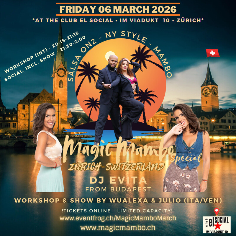 **Salsa On2 - NY Style - Mambo** ----------------- Music by DJ Evita (Budapest) Show by Wualexa Gonzalez & Julio Rojas (VEN/ITA) Workshop before the Social (20:15-21:15) by Wualexa & Julio ----------------- Tickets: www.eventfrog.ch/MagicMamboMarch !Limited Capacity! ----------------- Info: www.magicmambo.ch www.magicmambo.ch