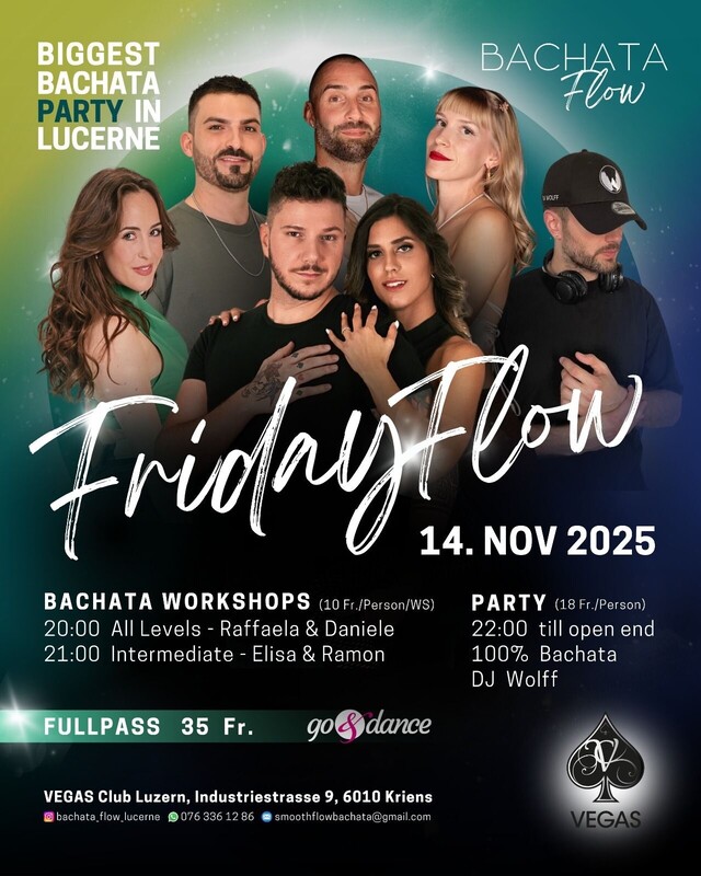 Bachata Workshops: 19:30 Uhr – Doors open 20:00 Uhr – All Levels mit Raffaela & Daniele 21:00 Uhr – Intermediate mit Elisa & Ramon Party: 22:00 Uhr till open end – 100% Bachata mit unserem favorite DJ Wolff Location:VEGAS Club Luzern, Industriestr. 9, 6010 Kriens (Garderobe & Parkplätze verfügbar) *Tickets*: https://www.goandance.com/en/event/8866/friday-flow-bachata-party-lucerne https://www.goandance.com/en/event/8866/friday-flow-bachata-party-lucerne