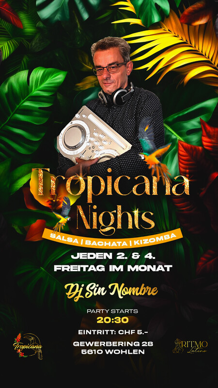 Jeden 2. & 4 Freitag Abend wird im Tropicana getanzt! Der Eintritt ist nur CHF5.- und ab 20.30 Uhr in Wohlen im Aargau wird ordentlich gefeiert. Es ist ein exklusiver Abend, welcher voller positiven Vibes, Spass und Lebensfreude dominiert wird, wo man in Ruhe üben/trainieren und sich unter Tänzer austauschen kann. Nimm deine Liebsten mit und geniesse die erstklassige Atmosphäre in Wohlen im Tropicana. ​Gratis Garderobe Es stehen ca. 40 gratis Aussenparkplätze vor dem Eingang und weitere 30 gebührenpflichtige in unmittelbarer Nähe zur Verfügung. Das Tropicana befindet sich im Industriegebiet und hat genügend Platz für alle Besucher. Du findest nicht alle Infos auf dem Flyer? Gerne kannst du uns über info@tropicanaclub.ch kontaktieren. ​=== TROPICANA === Gewerbering 28 | 5610 Wohlen | Aargau