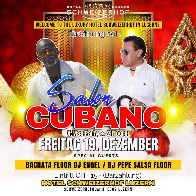 ★ FREITAG 19. DEZEMBER ★ Welcome to The Luxury 5 Star Hotel Schweizerhof in Lucerne ★ SALON CUBANO ★ X-Mas Party Der Legendäre SALSA & BACHATA Event in den beiden luxuriösen und exklusiven Räumen des luxuriösen Schweizerhof Hotels ★ TÜRÖFFNUNG 20h. ★ EINTRITT CHF 15.- (Nur Barzahlung) 20h. - 02h. --------------------------------------------------------- ★ ZEUGHEERSAAL > Salsa Floor mit DJ PEPE (Basel) Der prächtige Festsaal ist unser Juwel. Der im Jahr 1865 erbaute Ballsaal ist ideal für Grossanlässe mit bis zu 500 Personen und 360 m2 Tanz-Parkett. ★ WINTERGARTEN > Bachata Floor mit DJ ENGEL (Tessin) Mit seinem kunstvollen Glasgemälde an der Decke ist besonders beliebt für Kleinanlässe mit bis 95 m2 Tanz-Parquett. ------------------------------------------------------------------ DAS 5 STERNE HOTEL SCHWEIZERHOF LUZERN liegt direkt am Vierwaldstättersee und in unmittelbarer Nähe zum Stadtzentrum von Luzern. ------------------------------------------------------------------ Viele Parkplätze Möglichkeiten in der Nähe: www.parking-luzern.ch HOTEL SCHWEIZERHOF LUZERN Schweizerhofquai 3, 6002 Luzern www.schweizerhof-luzern.ch FACEBOOK https://fb.me/e/6W904w3UW