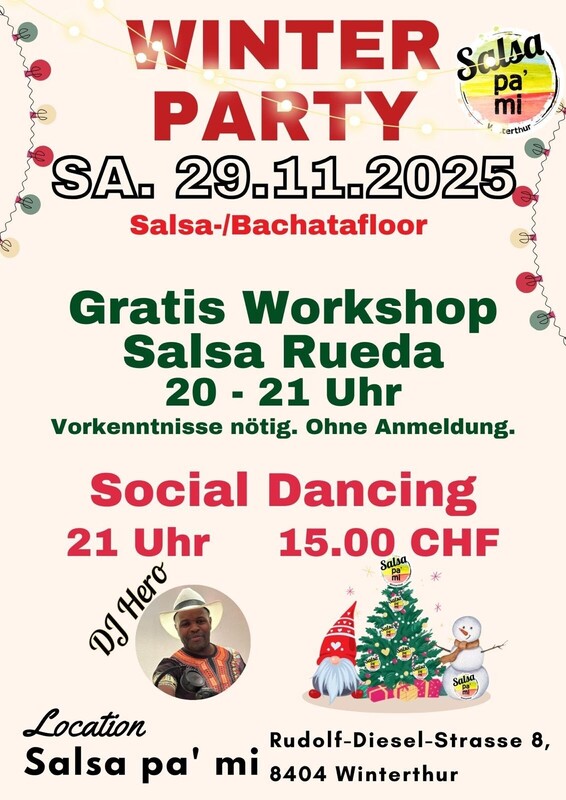 Geniesse diesen tollen Tanzabend in gemütlicher Atmosphäre. Alle sind herzlich willkommen! Salsa-/Bachatafloor | DJ HERO (50% Salsa / 50% Bachata) Wo: Studio Salsa pa' mi, Rudolf-Diesel-Strasse 8, 8404 Winterthur Wann: Samstag, 29.11.2025 Zeit: ab 21:00 Uhr Social Dancing Eintritt Social Dancing: 15.00 CHF | EC oder Barzahlung! Parkieren: Parkplätze in naher Umgebung vorhanden. +++++++ WORKSHOP | Salsa Rueda Mittelstufe | kostenlos! Vorkenntnisse nötig! Ohne Anmeldung, einfach vorbei kommen! Wo: Studio Salsa pa' mi, Rudolf-Diesel-Strasse 8, 8404 Winterthur Wann: Samstag, 29.11.2025 Zeit: 20:00 Uhr Vorkenntnisse: Level Mittelstufe. Vorkenntnisse nötig! https://salsapami.ch/#