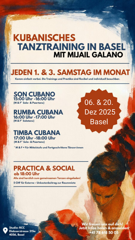 A Bailar 100%Cubano in Basel mit Mijail Galano 15:00 - Son Cubano 16:00 - Rumba Cubana 17:00 - Timba Cubana Ort: Studio: RCC Elsässerstrasse 215a 4056, Basel Info & Anmeldung 078 618 50 05 Aquí El Que Baila Goza 078 618 50 05