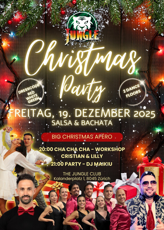CHRISTMAS PARTY FREITAG, 19. DEZEMBER 2025 Wir feiern das letzte mal zusammen im alten Jahr 2025❗Dazu laden wir euch ganz herzlich in den The Jungle Club ein auf Speis, Trank und gute Gesellschaft🥳 Wir freuen uns, gemeinsam noch einmal auf das vergangene Jahr anzustossen und den Abend zu geniessen voller Tanz und Musik🪩 ✨ Line-up: 💃 Cha Cha Cha Workshop 🕺Cristian & Lilly 🎶 Bachata Floor 🎶Salsa Floor 🔥Student Show ❗Grosses Christmas Apéro 🎧 DJ Maikiu 🕒 Timetable: 20:00 Cha Cha Cha Workshop 21:00 Party 22:00 Christmas Apéro 23:00 Salsa Show 🎟 Tickets: 👉 15 CHF ❗Ein Ticket für alles Christmas Apéro | Show | Workshop | Animation | Party www.thejungleclub.ch