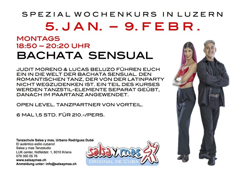 Bachata Sensual Wochenkurs bei Salsa y mas, Luzern ab Montag 5. Januar 2026. Lerne den romantischen Tanz kennen, der an keiner Latinparty fehlt! Es unterrichten Judit Moreno und Lucas Beluzo, ein junges und didaktisch gut geschultes Tanzlehrer Paar aus Taragona, Spanien. In diesem Kurs lernt man verschiedene Bachataschritte, Bewegungsmuster und einfache Drehungen. Ein Anteil des Kurses wird separat Bachata Ladies-, respektive Menstyling geübt. Kursdaten: Montag, 05.01. – 09.02.2026 18:50 - 20:20 Uhr 6 mal 1,5 Std. für CHF 210.-/Pers. Kurslokal: Salsa y mas Tanzstudio, LUK Center, Nidfeldstrasse 1, 6010 Kriens (an der Stadtgrenze Luzern) Anmeldung: Jetzt anmelden unter info@salsaymas.ch Tanzpartner von Vorteil aber nicht zwingend. Siehe auch www.salsaymas.ch für alle weiteren Kurse und Infos. Tanzschule Salsa y mas Urbano Rodríguez Dubé Salsa y mas Tanzstudio LUK Center, Nidfeldstrasse 1 6010 Kriens (Luzern) Tel: 079 350 05 76 / 078 861 54 11 info@salsaymas.ch www.salsaymas.ch Jedes Jahr Tanzreisen nach Kuba! „…para que conozcas a Cuba!“ www.salsaymas.ch