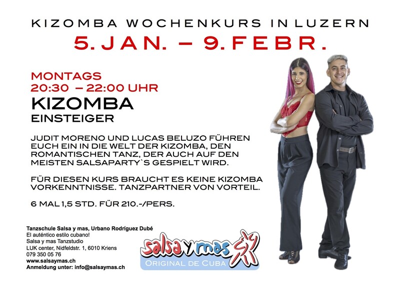 Kizomba Wochenkurs bei Salsa y mas, Luzern ab Montag 5. Januar 2026. Lerne den romantischen Tanz kennen, der an keiner Latinparty fehlt! Es unterrichten Judit Moreno und Lucas Beluzo, ein junges und didaktisch gut geschultes Tanzlehrer Paar aus Tarragona, Spanien. In diesem Kurs lernt man verschiedene Kizombaschritte, Bewegungsmuster und einfache Drehungen. Kursdaten: Montag, 05.01. – 09.02.2026 20:30 - 22:00 Uhr 6 mal 1,5 Std. für CHF 210.-/Pers. Kurslokal: Salsa y mas Tanzstudio, LUK Center, Nidfeldstrasse 1, 6010 Kriens (an der Stadtgrenze Luzern) Anmeldung: Jetzt anmelden unter info@salsaymas.ch Tanzpartner von Vorteil aber nicht zwingend. Siehe auch www.salsaymas.ch für alle weiteren Kurse und Infos. Tanzschule Salsa y mas Urbano Rodríguez Dubé Salsa y mas Tanzstudio LUK Center, Nidfeldstrasse 1 6010 Kriens (Luzern) Tel: 079 350 05 76 / 078 861 54 11 info@salsaymas.ch www.salsaymas.ch Jedes Jahr Tanzreisen nach Kuba! „…para que conozcas a Cuba!“ www.salsaymas.ch