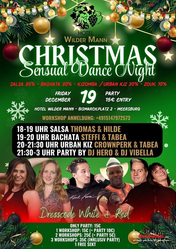 Christmas Sensual Dance Night – Die heißeste Weihnachtsfeier des Jahres! Mach dich bereit für eine unvergessliche Nacht voller Leidenschaft und Weihnachtszauber! Am Freitag, den 19. Dezember, verwandelt sich das Hotel Wilder Mann in Meersburg in ein sinnliches Tanzparadies mit Salsa, Bachata, Kizomba & Zouk! 🎶 🔥 Workshops & Partyplan: 🕕 18:00 – 19:00 Uhr: Salsa mit Thomas & Hilde 🕖 19:00 – 20:00 Uhr: Bachata mit Steffi & Tabea 🕗 20:00 – 21:30 Uhr: Urban Kiz mit Crownperk & Tabea 🕤 21:30 – 03:00 Uhr: Christmas Party mit DJ Hero & DJ Vibella ✨ Musikmix: Salsa 30% Bachata 30% Kizomba/Urban Kiz 30% Zouk 10% 💰 Eintritt & Workshops: Nur Party: 15€ (1 Glas Sekt Gratis 21:30-22:30) 1 Workshop: 15€ ( Party 10€) 2 Workshops: 25€ ( Party 5€) 3 Workshops: 35€ (inkl. Party) 🎄 Dresscode: White & Red – Lass dich vom Weihnachtsglanz inspirieren! 📍 Ort: Hotel Wilder Mann, Bismarckplatz 2, Meersburg 📞 Workshop-Anmeldung: 49 151 47972573 Lass den Alltag hinter dir, schnapp dir deine Tanzschuhe und feiere mit uns eine sinnliche Weihnacht voller Musik, Bewegung und Freude in einer Traumlocation! 💫
